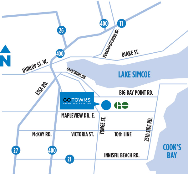 Located at Yonge St. & Mapleview Dr. E, GO Towns provides residents with immediate access to transit options just steps away. Residents can expect to reach bus stops and the Barrie South GO Station only minutes away on foot, allowing residents to travel around Barrie, as well as the GTA, without the need for a car. Those who do drive will be able to reach Hwy 400 in just minutes. Shopping, groceries, and dining can be reached at Heritage Square Shopping Mall, Park Place Shopping Mall, Summit Centre Shopping Mall, and SmartCentres Barrie South, all of which can quickly be reached by transit or car. Those who enjoy nature or wish to step away from the urban noise will appreciate the close proximity to the waterfront, various parks, and trails.